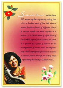 Shakuntala Bharne's maiden album GOF weaves togther captivating variety that exitsts in Konkani music of Goa. Gof means a pattern in which threads of different colours or various strands are woven together in a pattern. It is also the name of a folk dance of Goa in which ropes of various colours are woven in a pattern by a group of dancers to the accompaniment of verses, music and rhythmic steps. GOF is appropriately titled as it presents a cultural pattern through ten lilting songs representing the varitey in Konkani music.